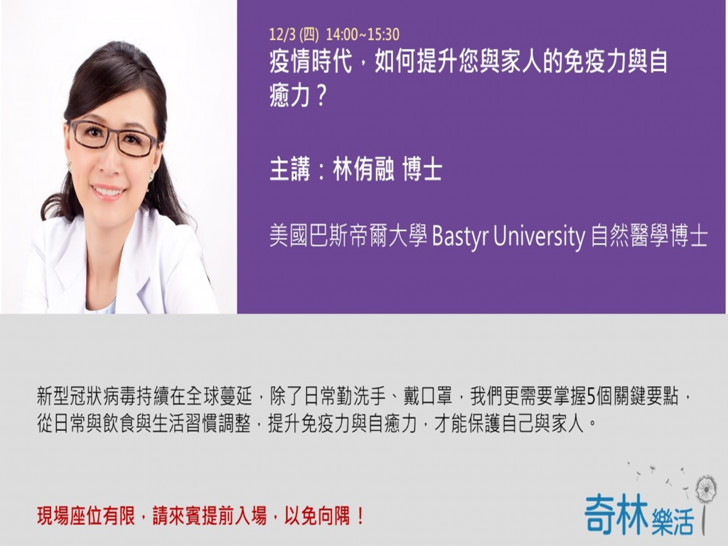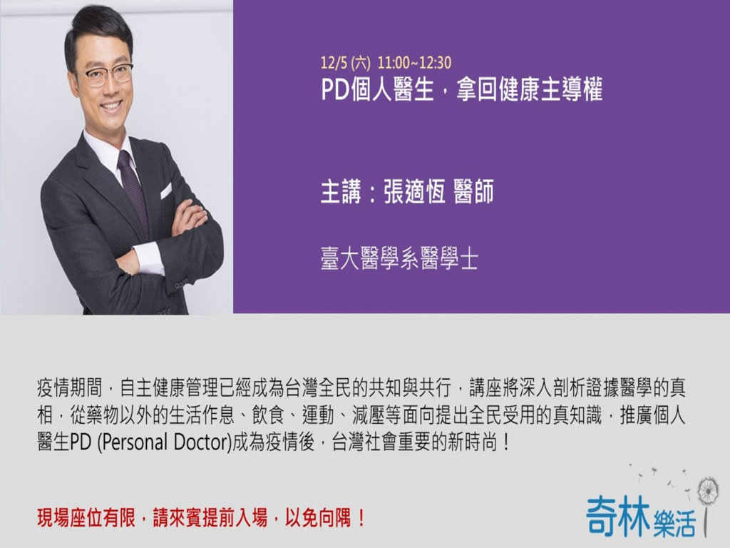 疫情期間,自主健康管理已經成為台灣全民的共知與共行,講座將深入剖析證據醫學的真相,從藥物以外的生活作息、飲食、運動、減壓等面向提出真知識,推廣全民成為個人醫生PD。