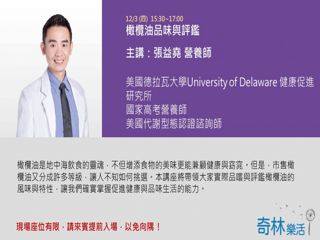 橄欖油是地中海飲食的靈魂,增添食物的美味更能兼顧健康與窈窕。講座將帶領大家實際品嚐與評鑑橄欖油,掌握健康與品味生活的能力。