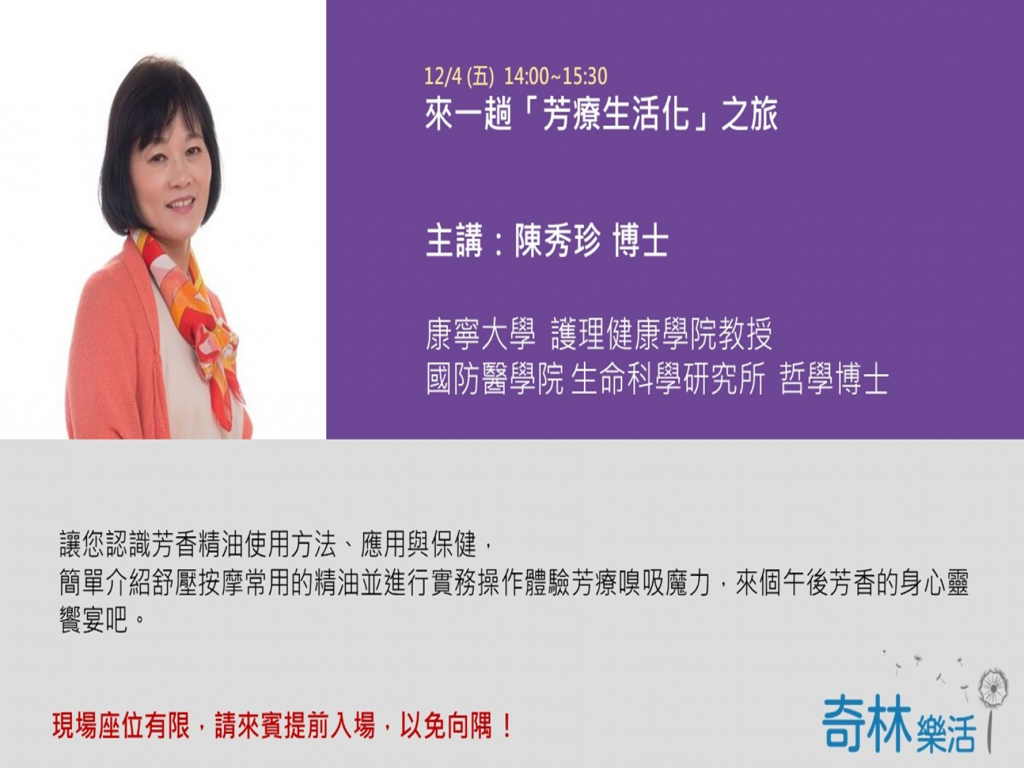 讓您認識芳香精油使用方法、應用與保健, 簡單介紹舒壓按摩常用的精油並進行實務操作體驗,來個午後芳香的身心靈饗宴吧。