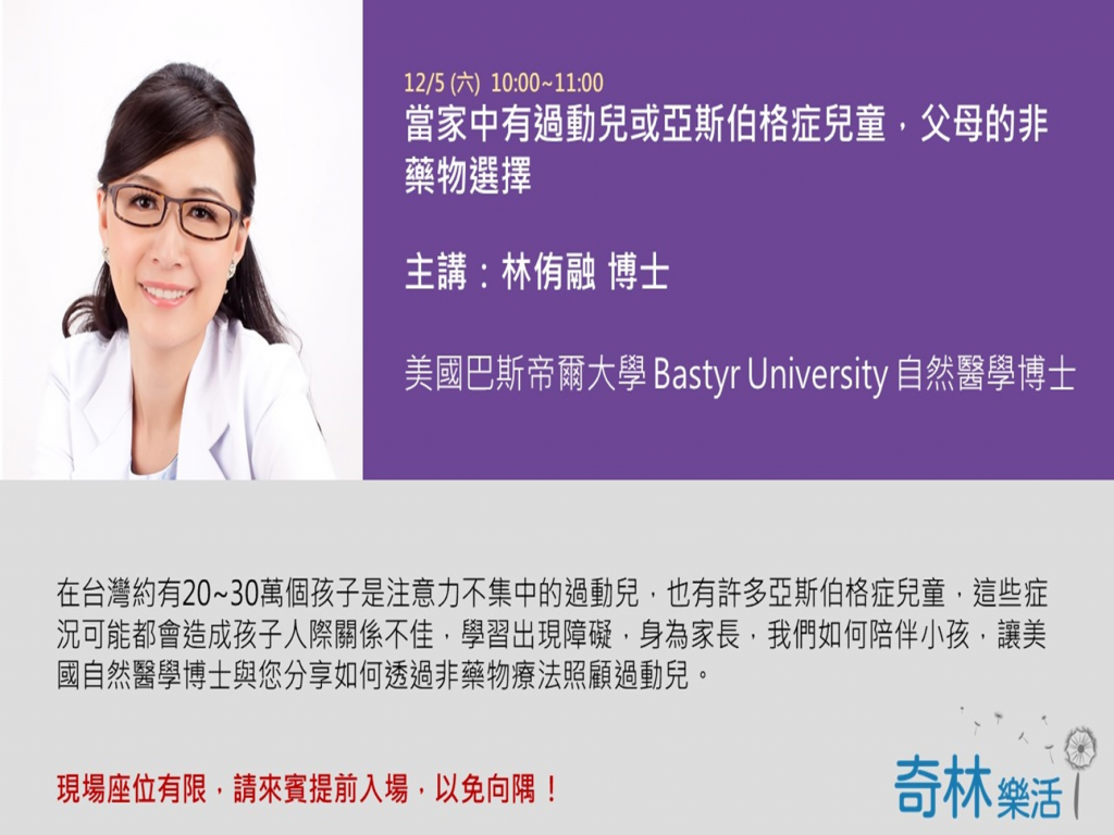 注意力不集中的過動兒及亞斯伯格症兒童,可能會造成孩子人際關係不佳,學習出現障礙,讓美國自然醫學博士與您分享如何透過非藥物療法照顧過動兒。