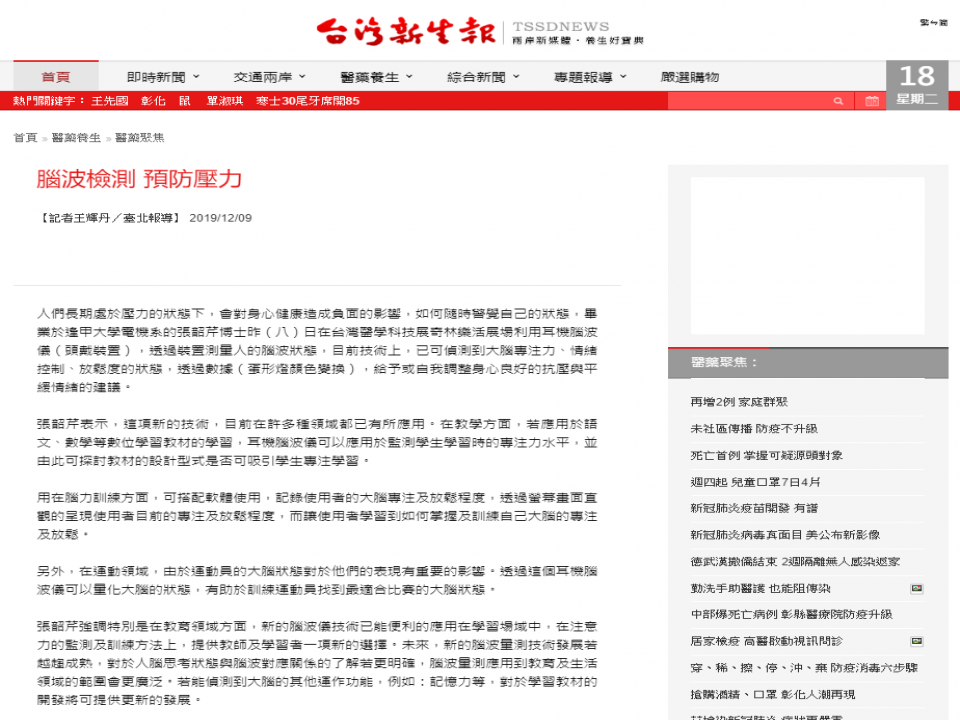 人們長期處於壓力的狀態下,會對身心健康造成負面的影響,如何隨時警覺自己的狀態,畢業於逢甲大學電機系的張韶芹博士昨(八)日在台灣醫學科技展奇林樂活展場利用耳機腦波儀(頭戴裝置),透過裝置測量人的腦波狀態。